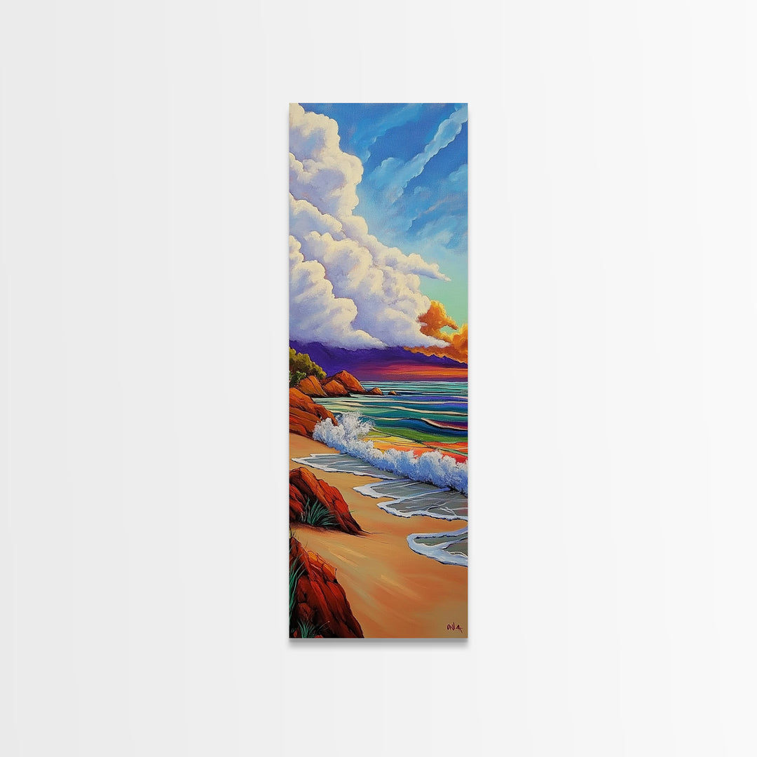 Peaceful Shoreline, Colorful Sunset, Framed Canvas Print ocean waves art, colorful sunset beach painting, vibrant sky seascape, nature art