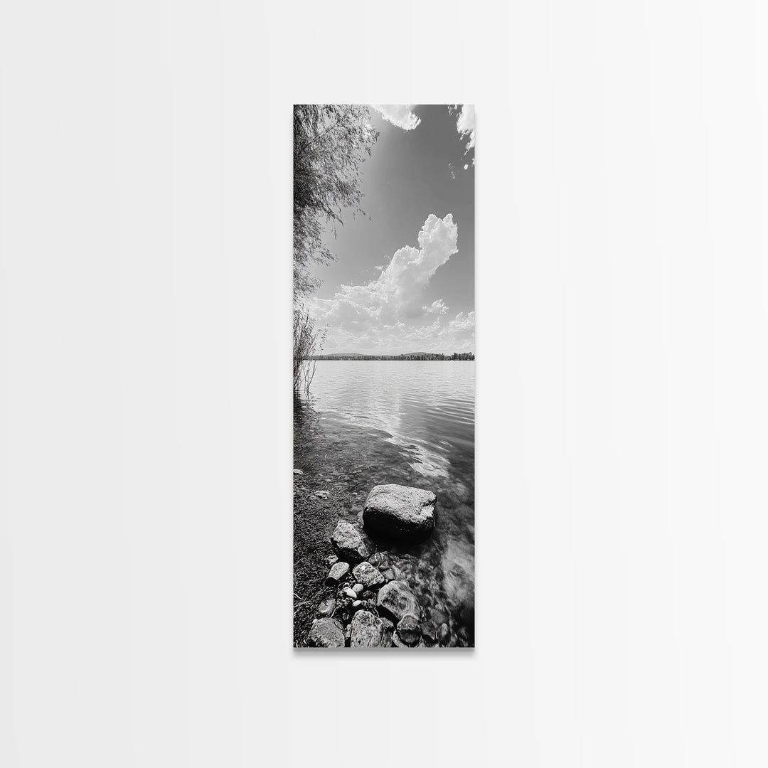 Peaceful Lake, Cloud Reflection, Shoreline Stones, Framed Canvas Print, Guest Room Wall Art, Nature Inspired Decor, Minimalist Landscape
