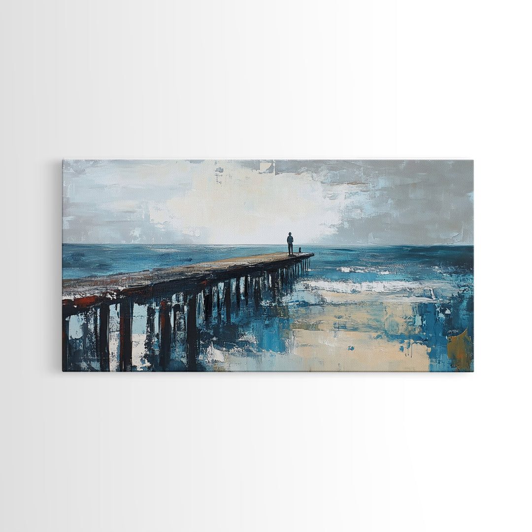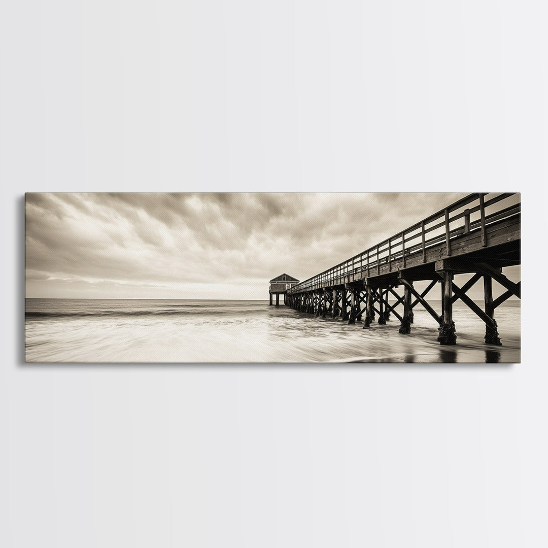 Pier at Dusk, moody art, coastal wall art, ocean painting, nautical painting, wabi sabi art, panoramic art, Canvas Print, seascape