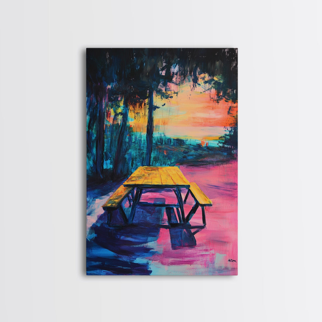Picnic Sunset, landscape painting, moody art, rustic decor, colorful wall art, whimsical art, pink orange wall art, canvas print
