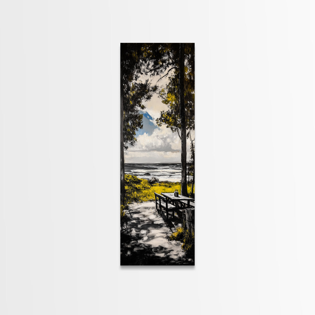 Picnic By Sea, Rustic Landscape, Coastal Escape, Canvas Print, Nature Inspired Art, Dining Room or Cabin Wall Decor, Bedroom Wall Art