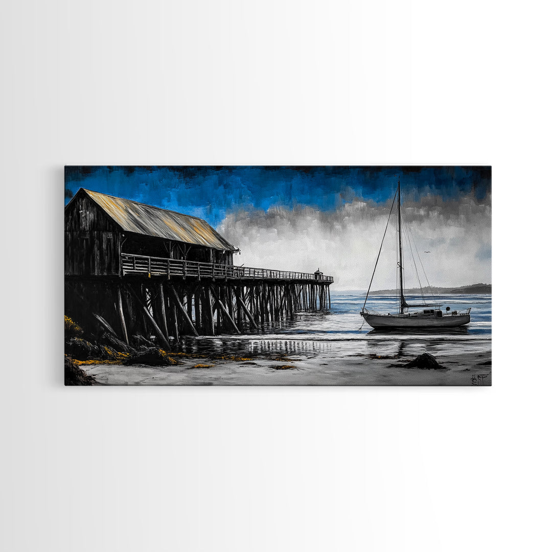 Pier and Boat, Seaside Wall Art, Coastal Landscape, Framed Canvas Print, Nautical Home Decor, Large Artwork, Ocean Painting