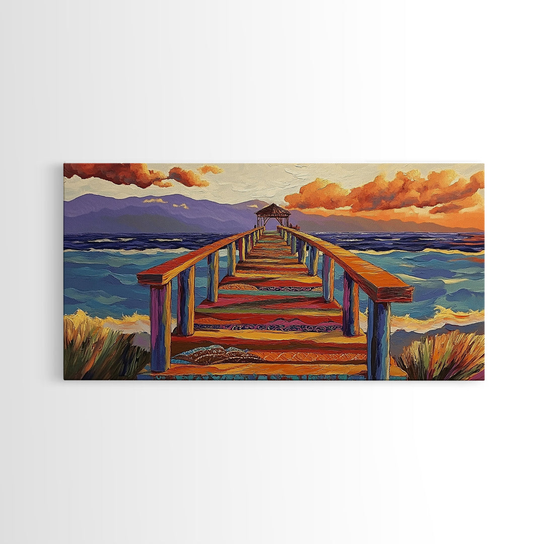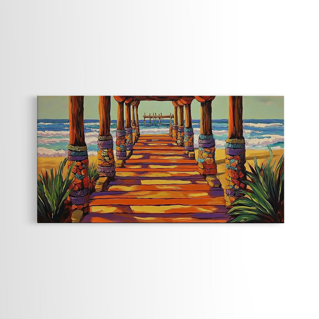 Pier Beach, Sunset, Vibrant, Canvas Print tropical coastal wall art, beach hallway decor, ocean waves painting, summer home artwork