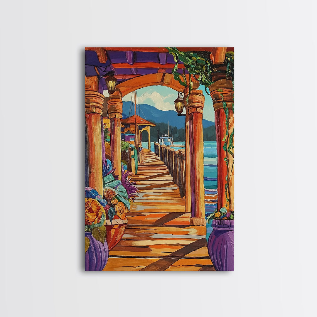 Pier Columns, Flowers, Harbor, Canvas Print, Nautical Decor, Beach Cottage Wall Art, Vibrant Boho Seaside Painting, Coastal Living