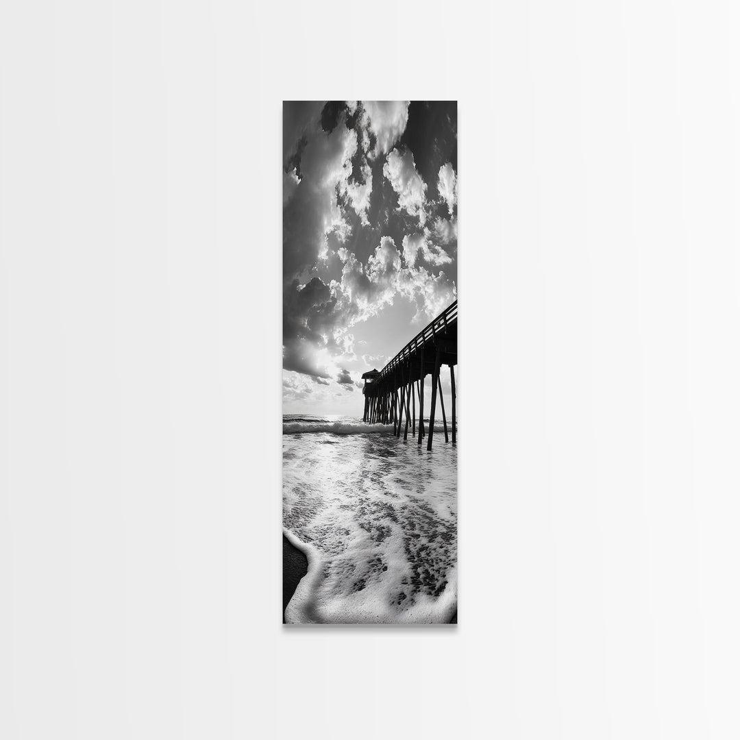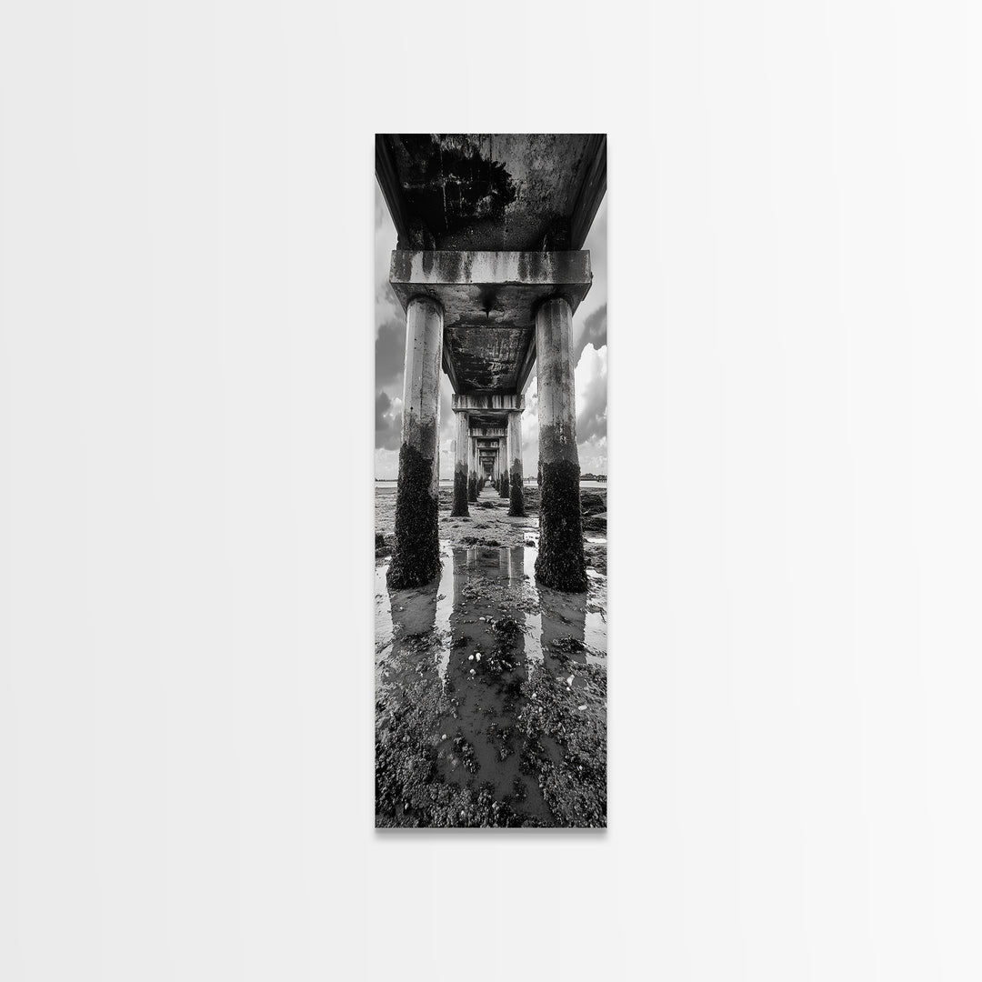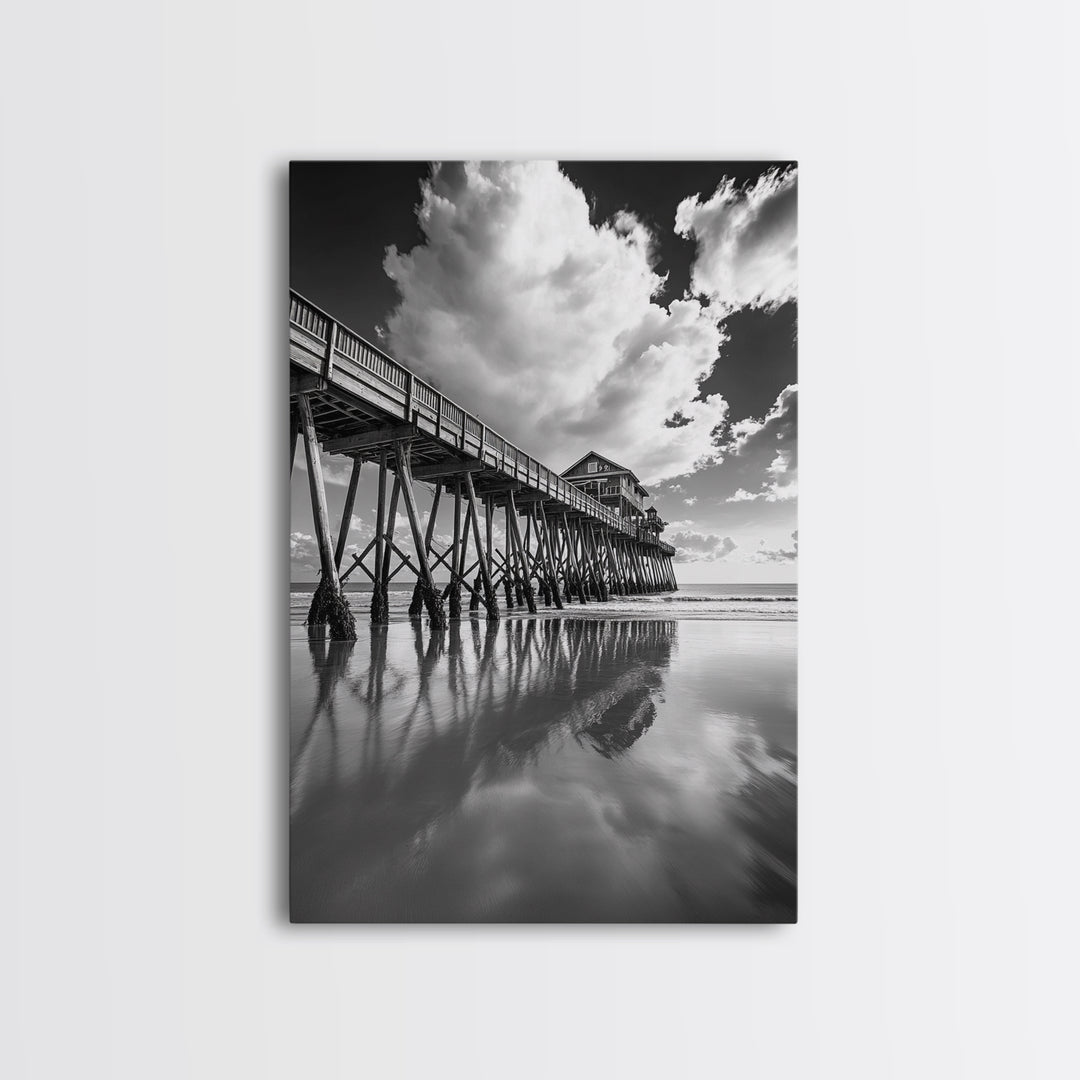 Pier reflection, seascape painting, nautical decor, rustic wall art, black and white photography, extra wide art, framed canvas print