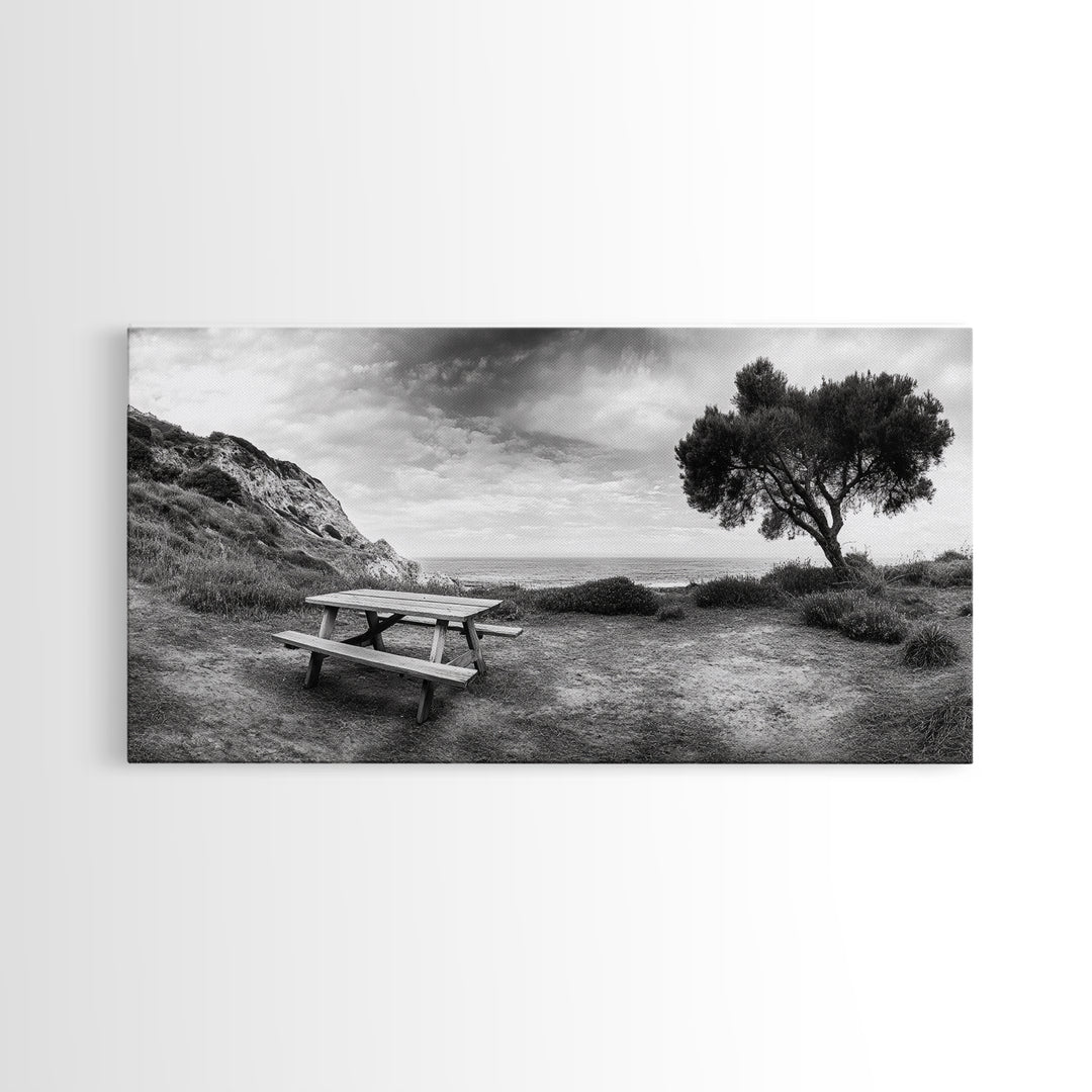 Picnic Table View, Coastal Meadow Scene, Tree and Cliff Horizon, Framed Canvas Print, Relaxing Kitchen or Outdoor Patio Wall Art
