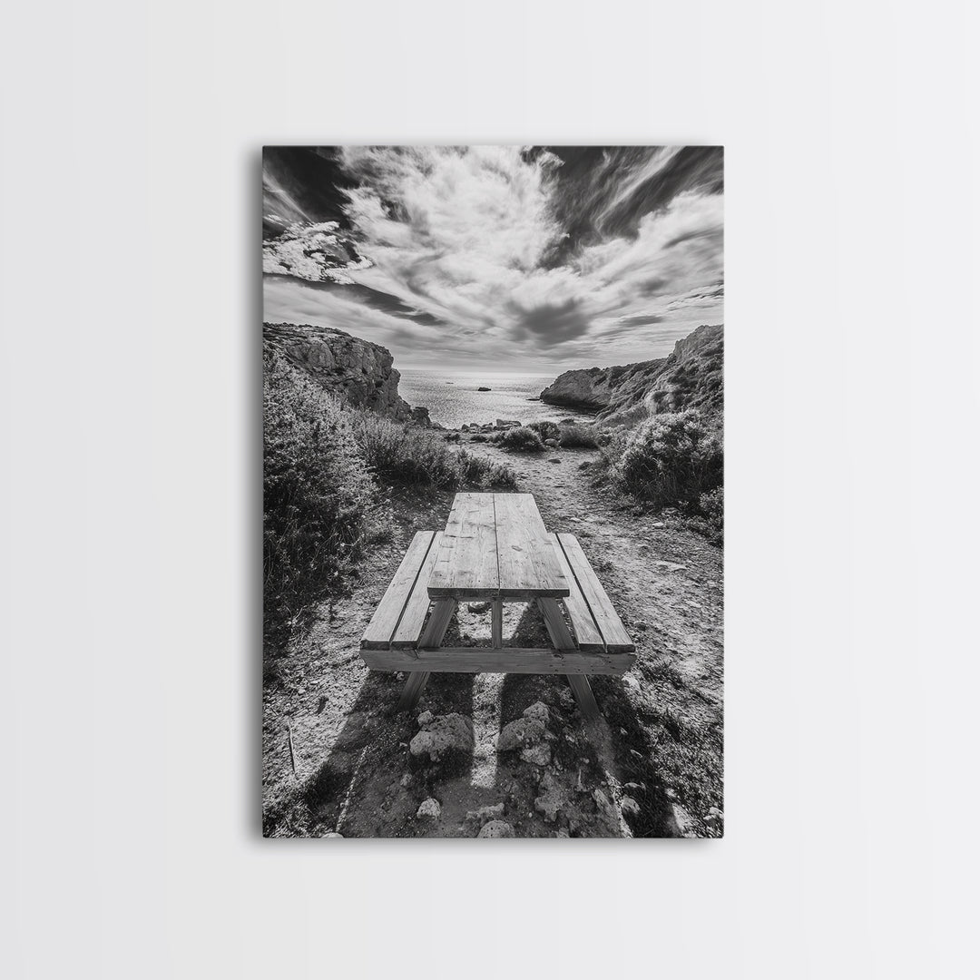 Picnic Table, Coastal Landscape Art, Beach House Decor, Relaxing Ocean Scene, Seaside Escape, Cottage Core, Canvas Print