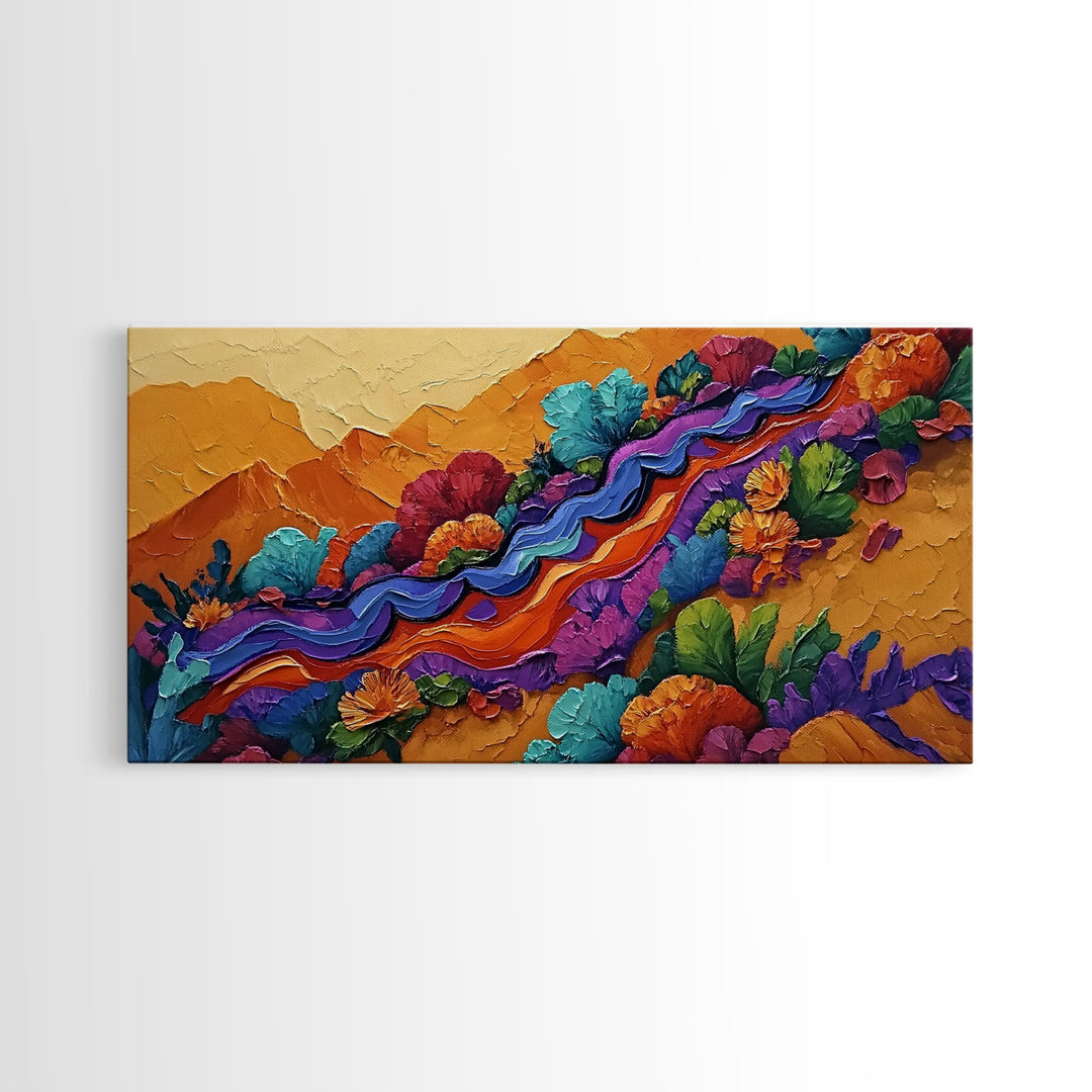 Mountains Flowers, Layers, Texture, Canvas Print, colorful impasto abstract mountain scene, modern art piece, textured fall wall decor