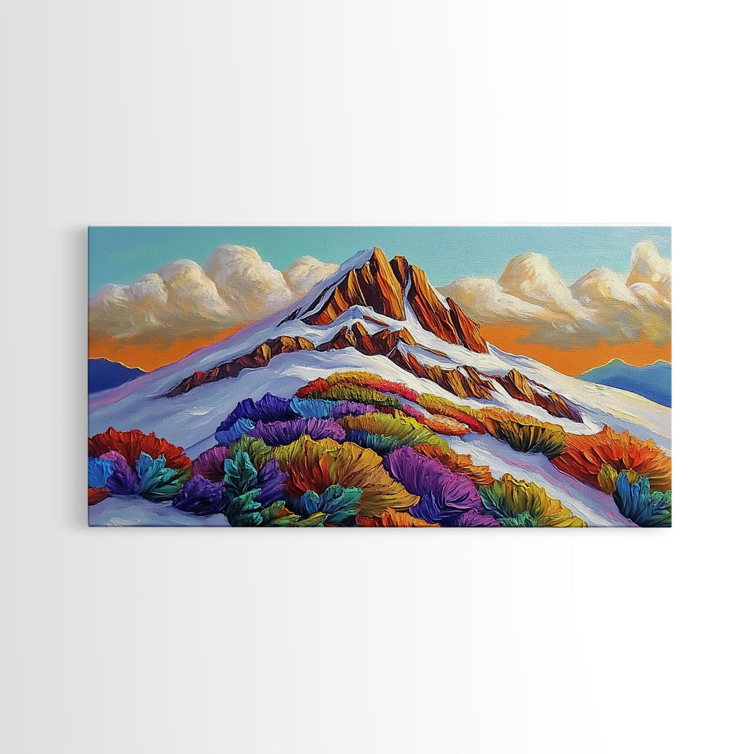 Mountain, Snow, Bloom, Sunrise, Canvas Print, Vibrant alpine flower wall art, colorful winter decor, bedroom cabin landscape artwork