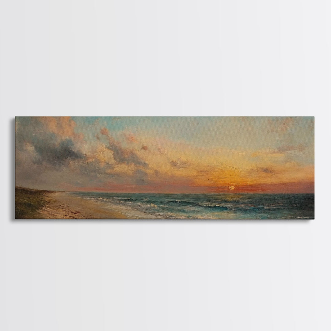 Muted Beach Framed Oil Painting Canvas Print, Minimalist Coastal Decor, Seascape Painting, Long / Horizontal Beach Wall Art, Panoramic Art