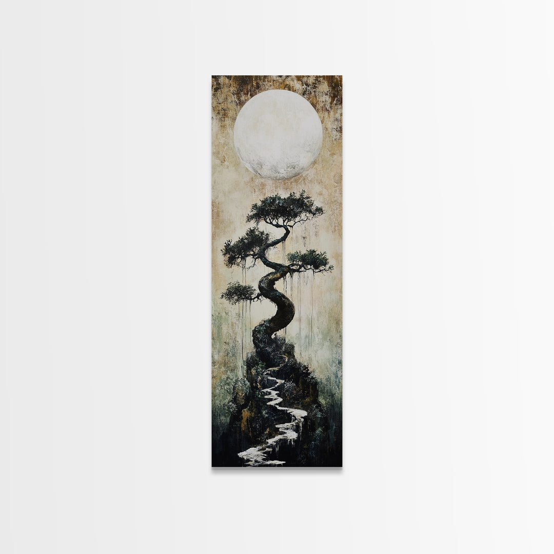 Mystical Moon and Bonsai Canvas Print Zen Wall Art Serene Wabi Sabi Decor Minimalist Nature Artwork Vertical Framed Artwork