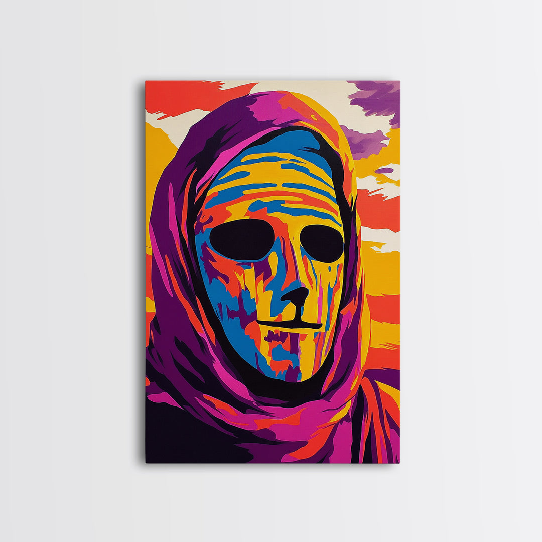 Mystical Portrait, Colorful Mask Art, Framed Canvas Print, Bold Modern Decor, Abstract Face Art, Living Room Art, Surreal Wall Decor