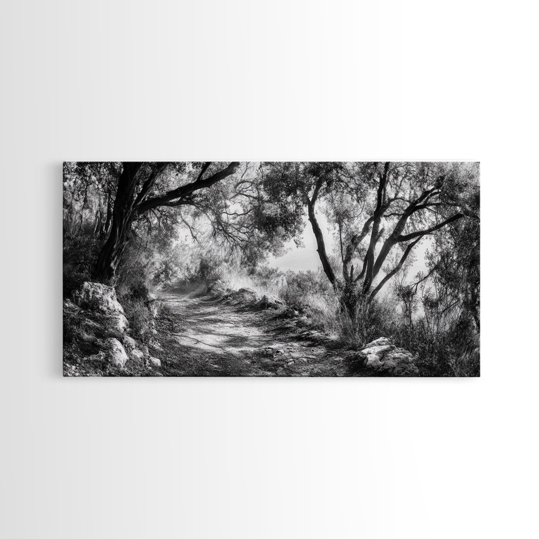 Nature Pathway Art, Black White Landscape, Tranquil Forest Trail, Framed Canvas Print, Rustic Living Room Decor, Cottagecore Wall Art