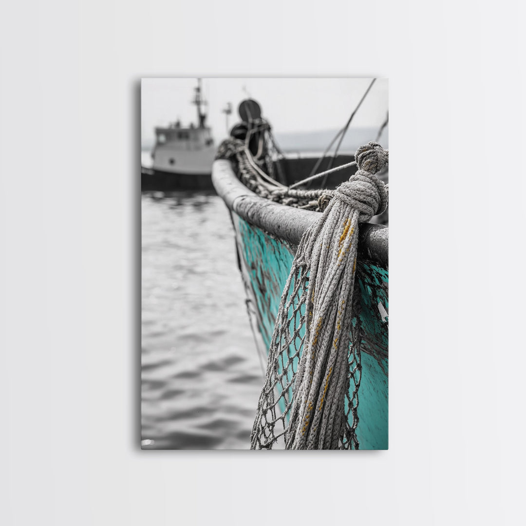 Nautical Texture, Vintage Boat, Rope Detail, Fishing Vessel, Framed Canvas Print, Coastal Wall Art, Rustic Decor, Maritime Photography