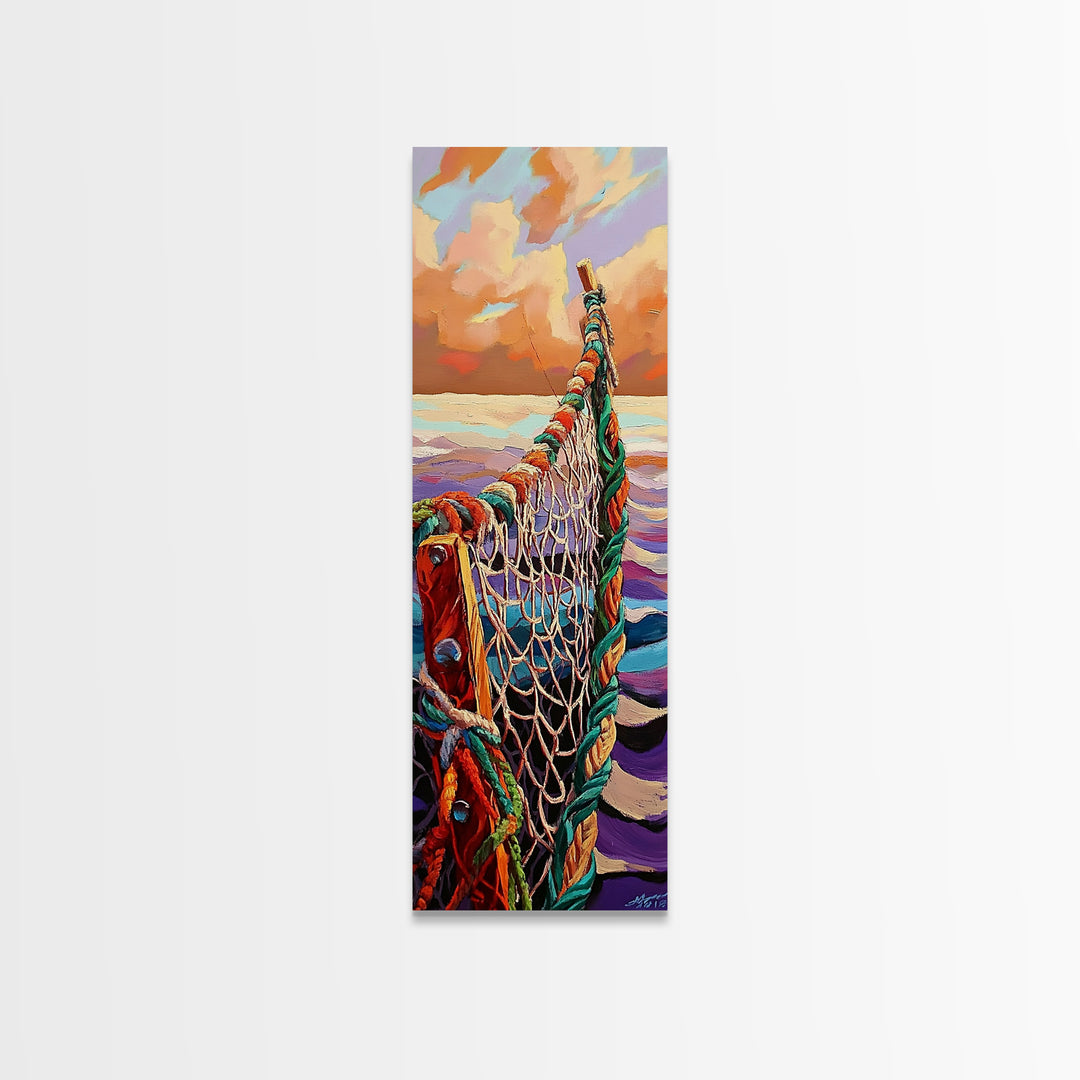 Net Ocean, Sunset Nautical – Canvas Print rustic fisherman’s net painting, nautical themed wall art, beach decor, living room statement art