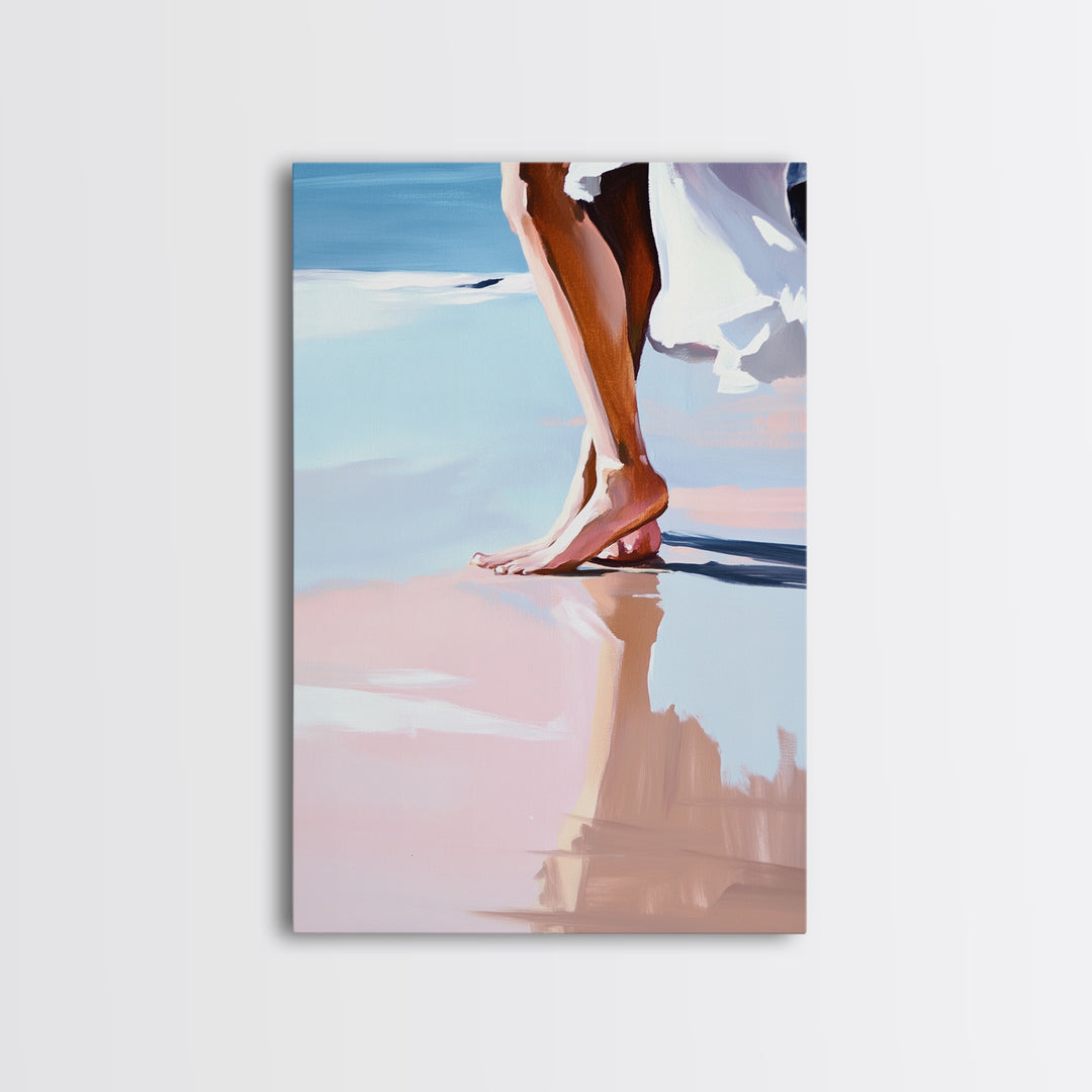 Barefoot Walk, Beach Reflection, Seaside Painting, Framed Canvas Print, Coastal Home Decor, Boho Art, Relaxing Bedroom Wall Art
