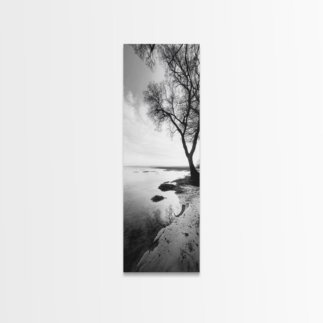 Bare Tree Reflection, Minimal Winter Shoreline, Calm Monochrome Art, Framed Canvas Print, Scandinavian Living Room Art, Bathroom Art