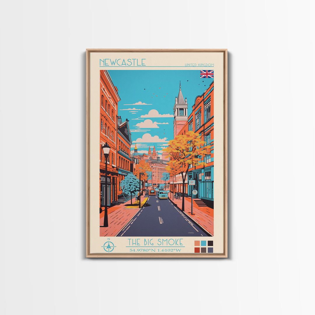 Newcastle United Kingdom Travel Poster Framed Canvas Print, Midcentury Modern Art, Pop Art Wall Decor, Scenic Living Room Art, Bedroom Decor