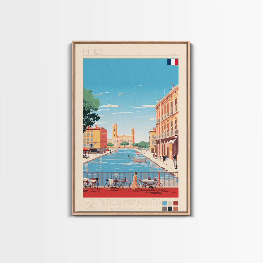 Nimes France Travel Poster Framed Canvas Print, Midcentury Modern Art, Pop Art Wall Decor, Scenic Living Room Art, Bedroom Gift
