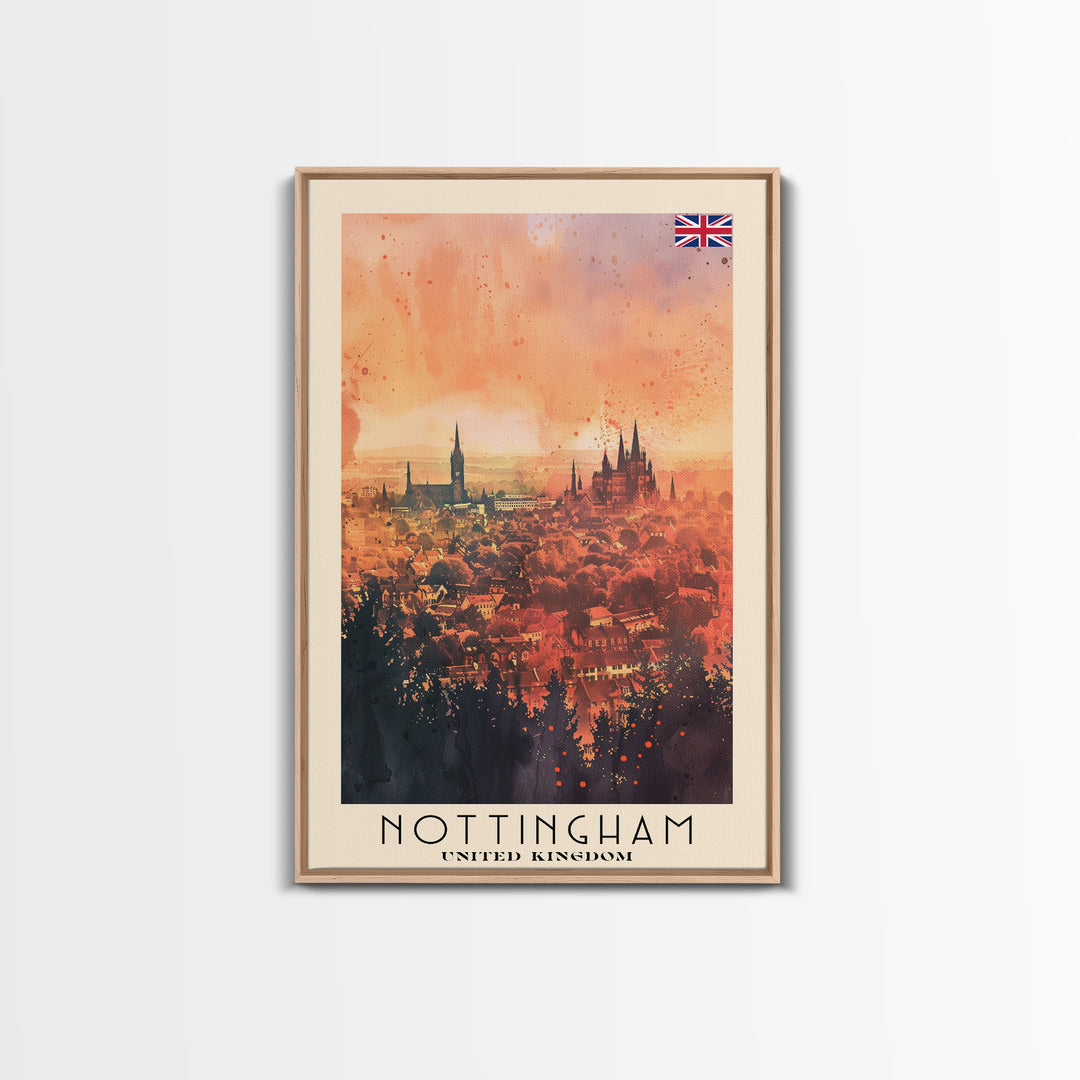 Nottingham United Kingdom Travel Poster Framed Canvas Print, Watercolor Painting, Scenic Wall Art, Home Decor, British Cityscape, Modern Art
