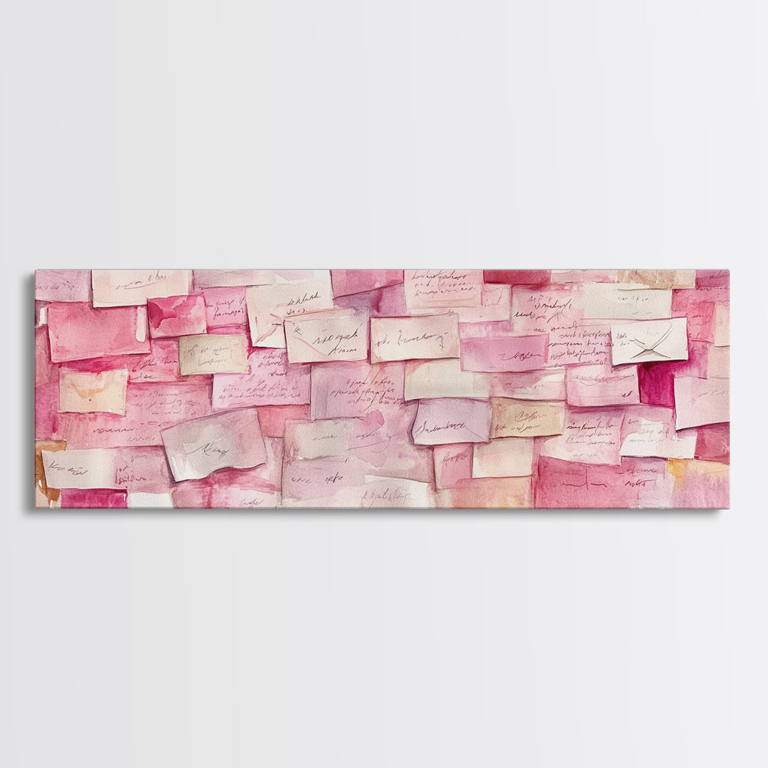 Notes Collage Painting Framed Canvas Print in Pink and Peach Hues, Rustic Cottagecore Wall Art, Horizontal Whimsical Artwork