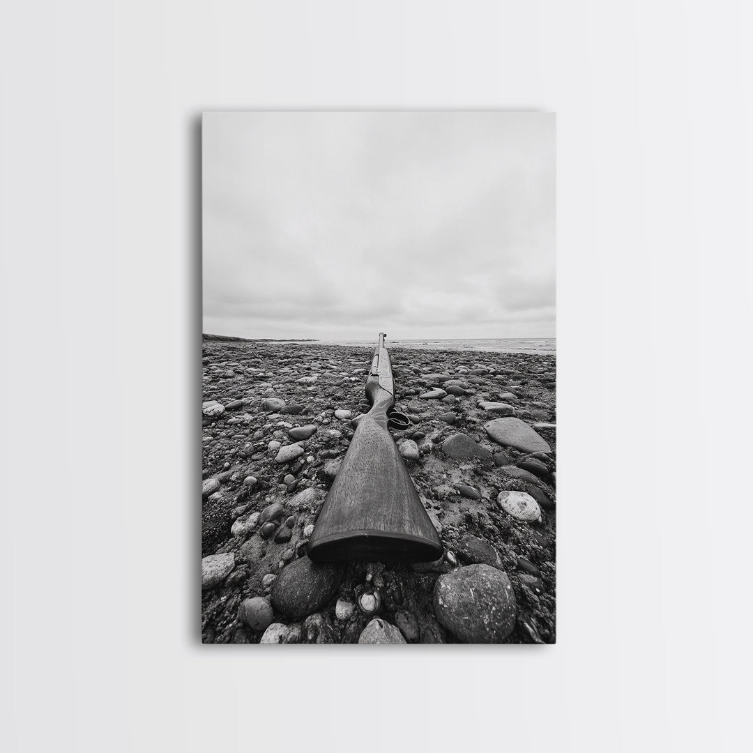 Rifle on Pebbles, Rustic Coastal, Survivalist Aesthetic, Canvas Print, Cabin Wall Art, Masculine Decor, Nature Minimalist Style