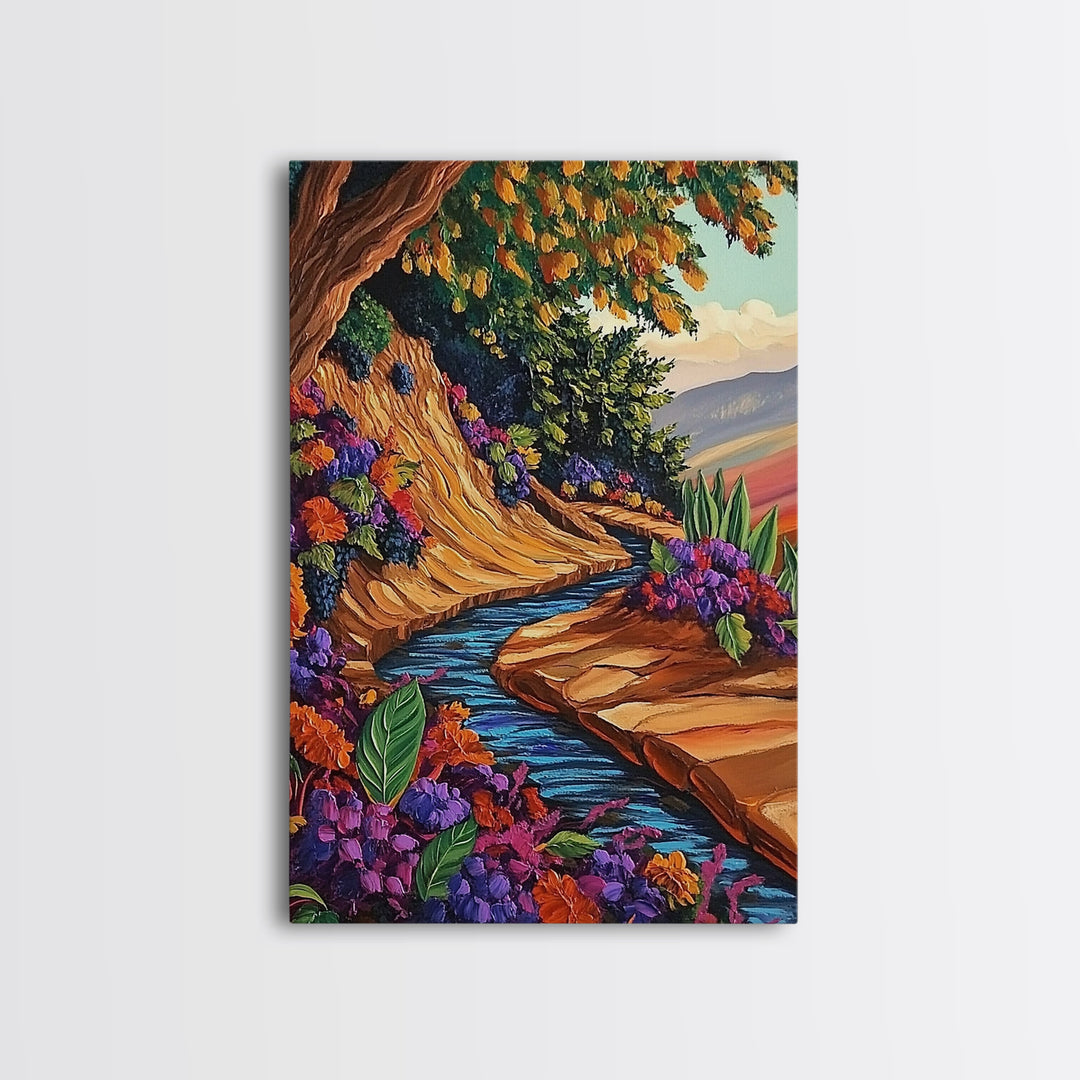 River Abstract, Color, Framed Canvas Print, Textured abstract river canyon painting, Desert Vibe Landscape Art, Hallway Wall Art