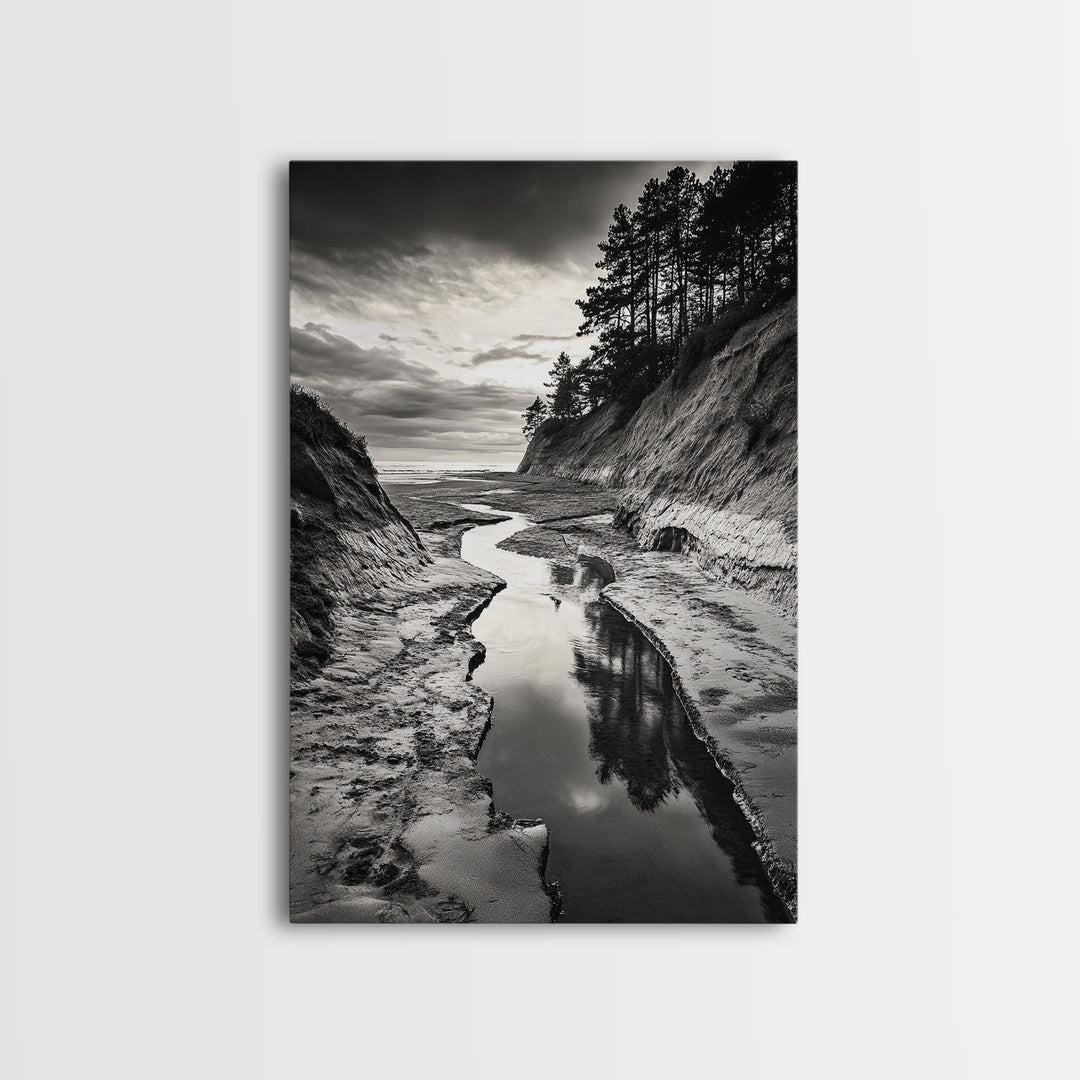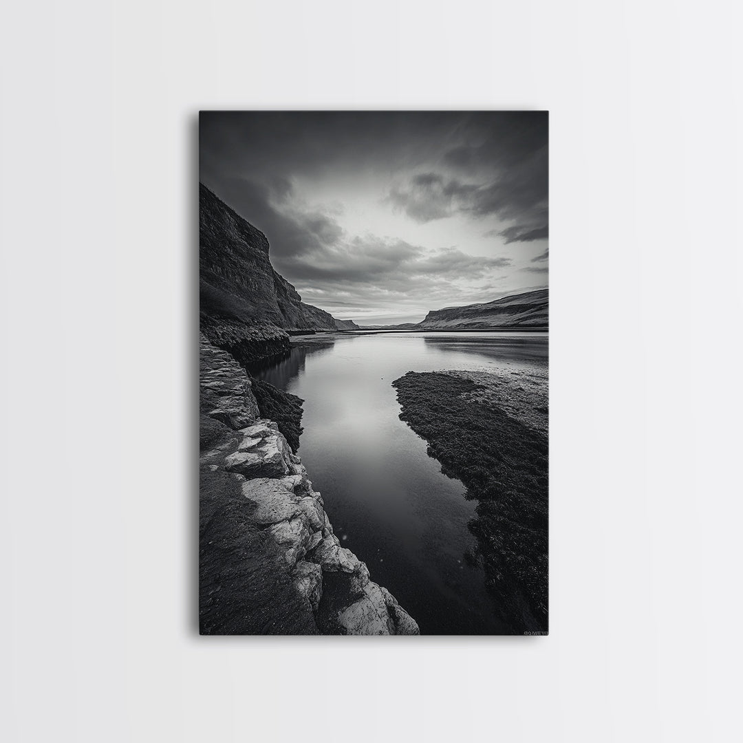 River Gorge, Twilight Reflections, Cliffside Calm, Canvas Print, Moody Black White Wall Art, Bedroom or Office Decor, Dramatic Landscape