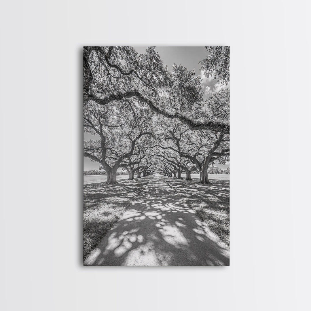 Oak Tree Tunnel, Southern Charm, Shaded Pathway, Timeless Trees Framed Canvas Print, farmhouse wall decor, hallway landscape art