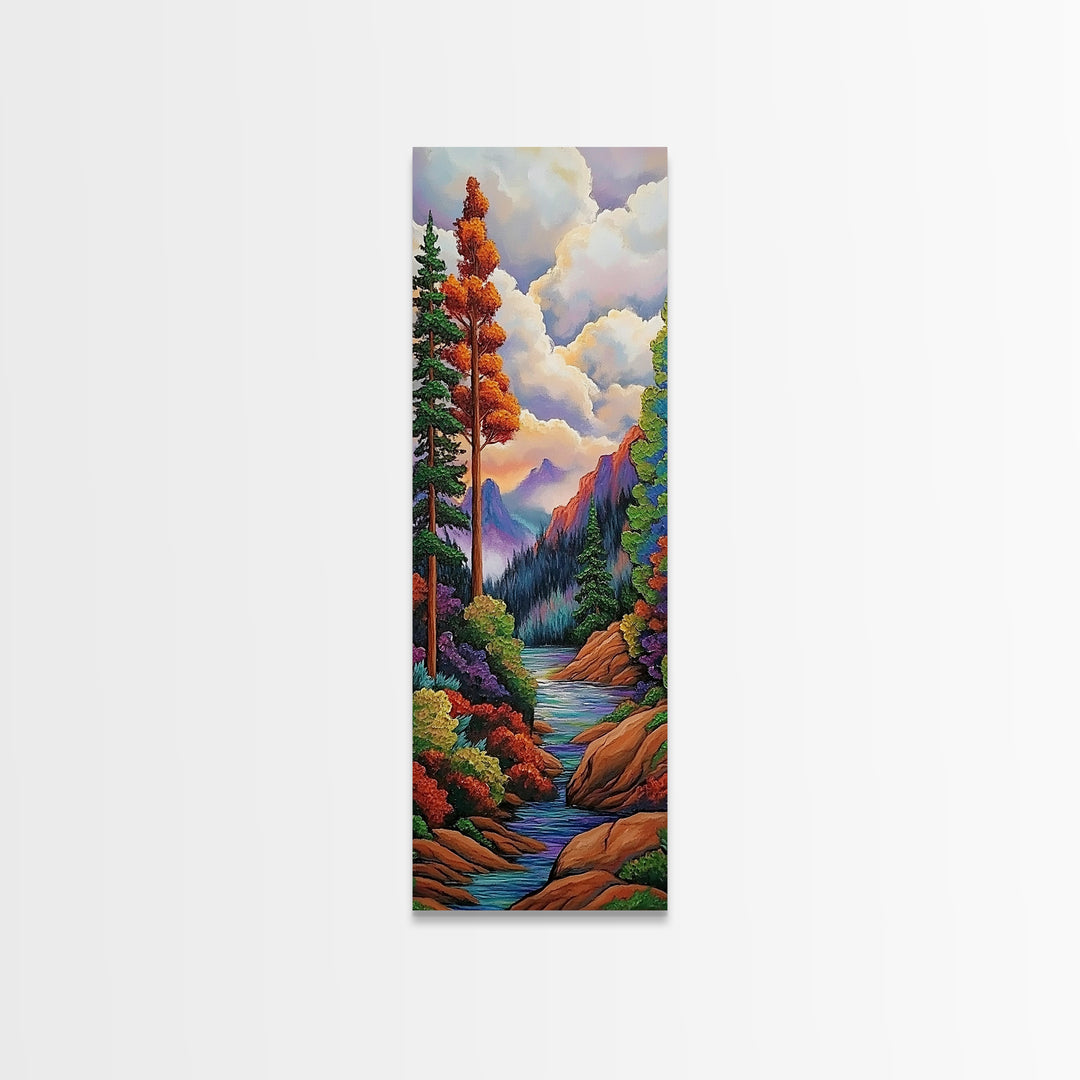 River, Forest, Autumn, Tranquility, Framed Canvas Print with mountain stream through trees, colorful Fall art, rustic lodge wall decor