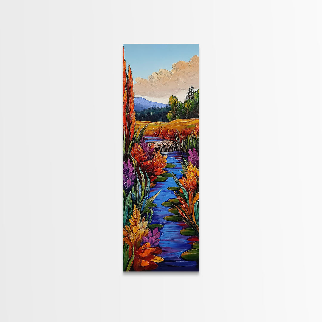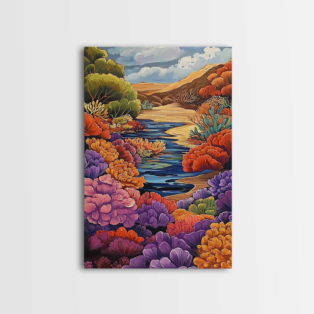 River, Desert, Floral, Art, Canvas Print, Colorful floral river scene with desert hills, perfect bedroom or hallway Southwestern wall art