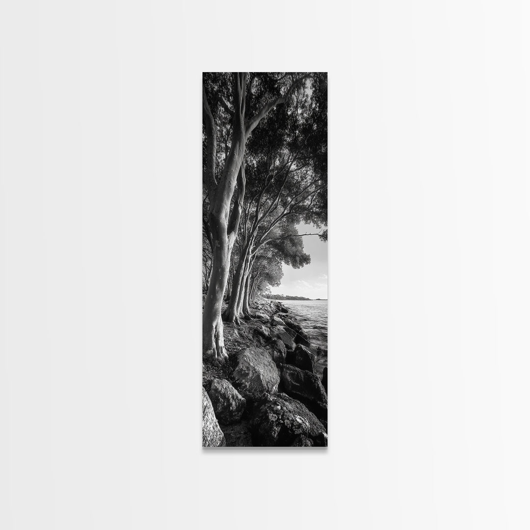 Riverside Trees, Rocky Shore, Natural Light, Canvas Print, Tranquil Forest Photography, Boho Nature Decor, Living Room Wall Art