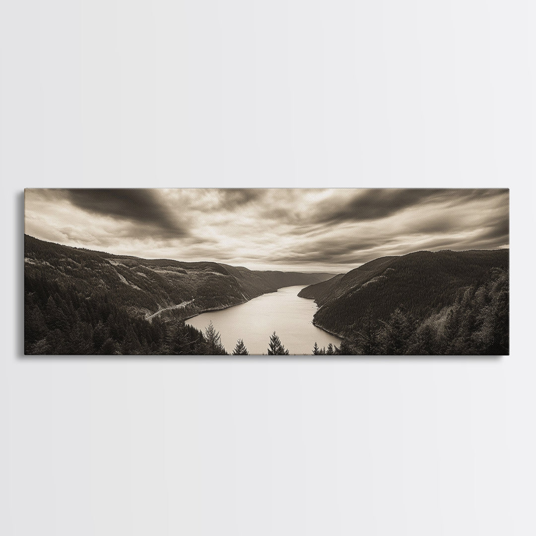 River Valley View, Dramatic Sky, Forest Landscape, Framed Canvas Print, Nature Photography, Entryway Wall Art, Moody Earth Tones
