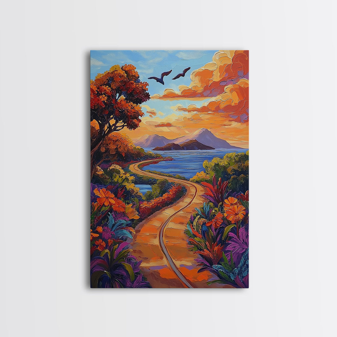 Road Sunset Coast, Tropical, Canvas Print vibrant scenic sunset path artwork, colorful landscape decor, Living Room Wall Art, fall art