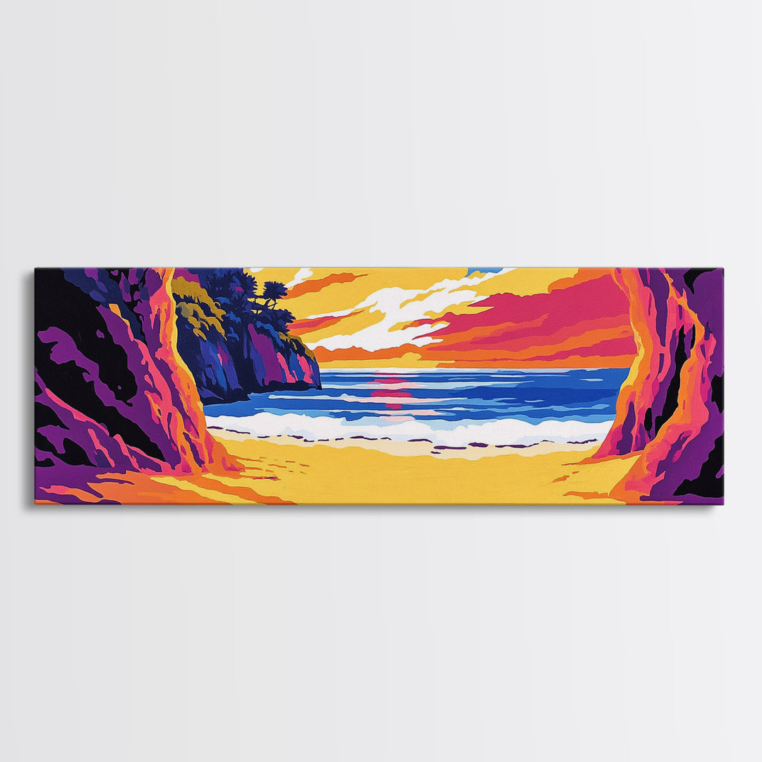 Ocean Cave View, Sunset Waves, Coastal Decor, Tropical Art, Framed Canvas Print, Beach House Wall Art, Vibrant Seascape, Boho Style