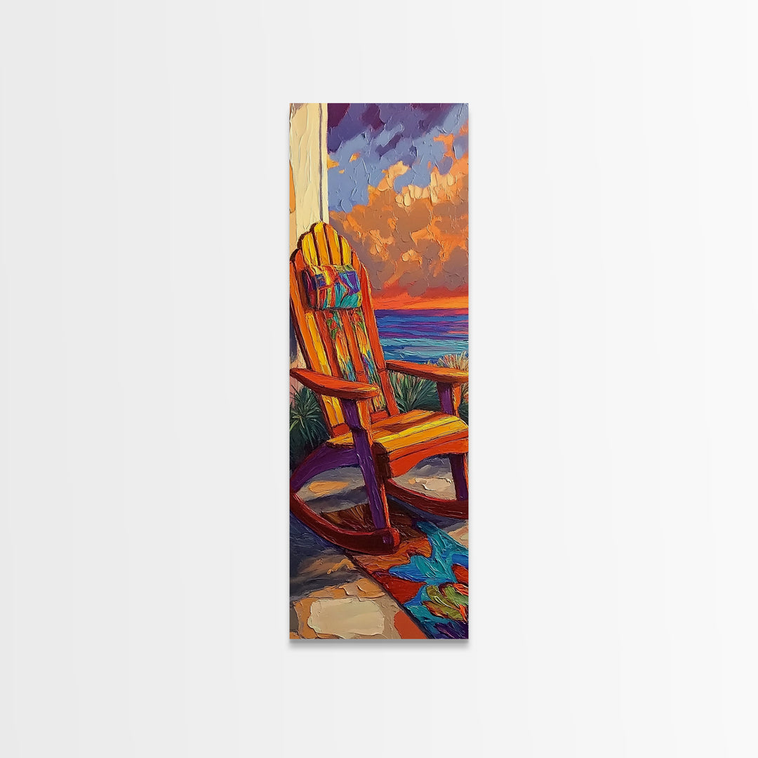 Rocking Chair Sunset Porch – Cozy Beach House Art, Vibrant Cottagecore Aesthetic, Framed Canvas Print, Relaxing Living Room Decor