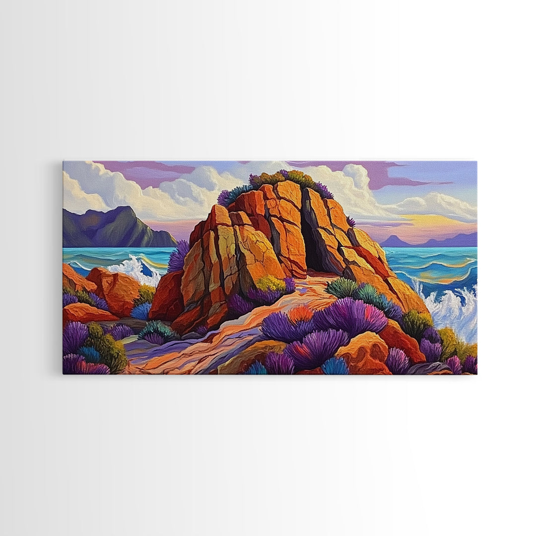 Ocean Cave, Rocky Coast, Lavender Brush, Framed Canvas Print, Bold Nature Wall Art, Vibrant Bedroom or Study Coastal Decor