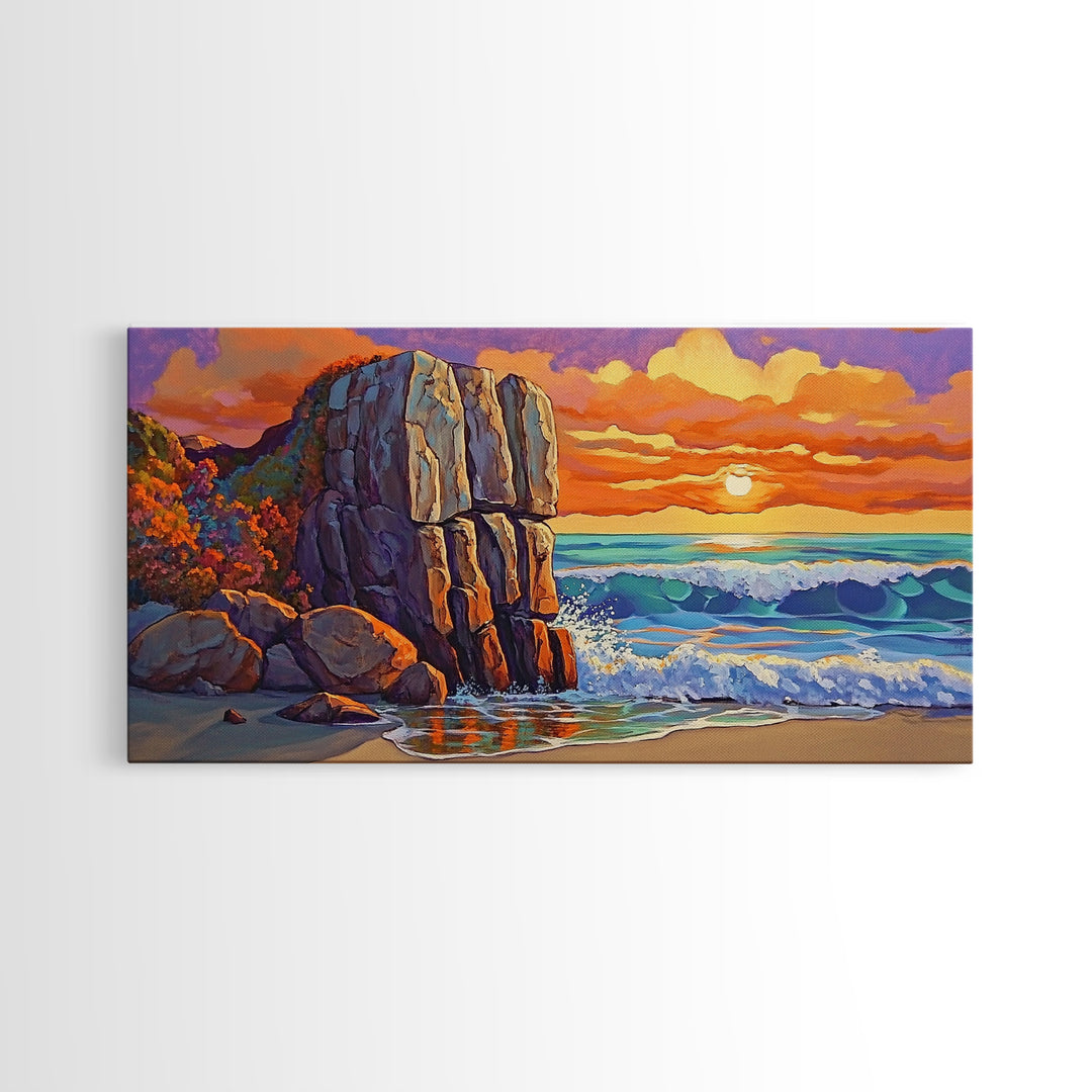 Rock Ocean, Sunset, Waves, Framed Canvas Print, coastal wall decor, bold shoreline art, living room beach style, nature theme