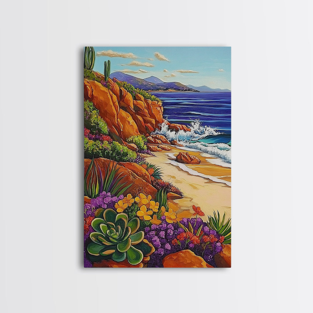Ocean Cactus, Sunset, Framed Canvas Print, Southwest Coastal Art, Desert Beach Wall Decor, Colorful Nature Scene, Bathroom Wall Art