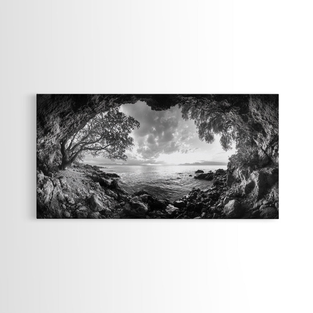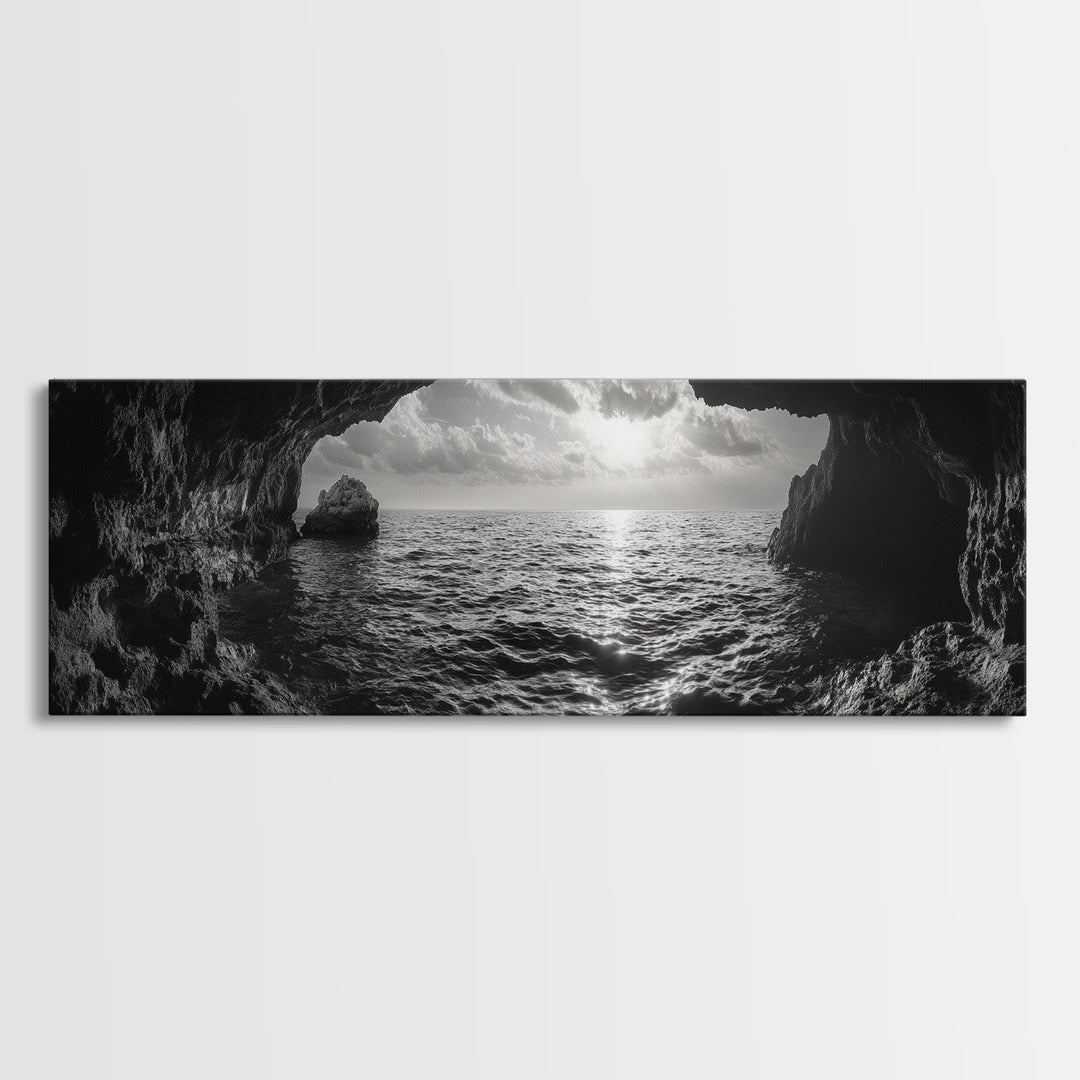 Ocean Cave, Tranquil Waters, Cloudy Sky, Coastal Wall Art, Canvas Print, Black and White Nature Decor, Modern Beach House Wall Art