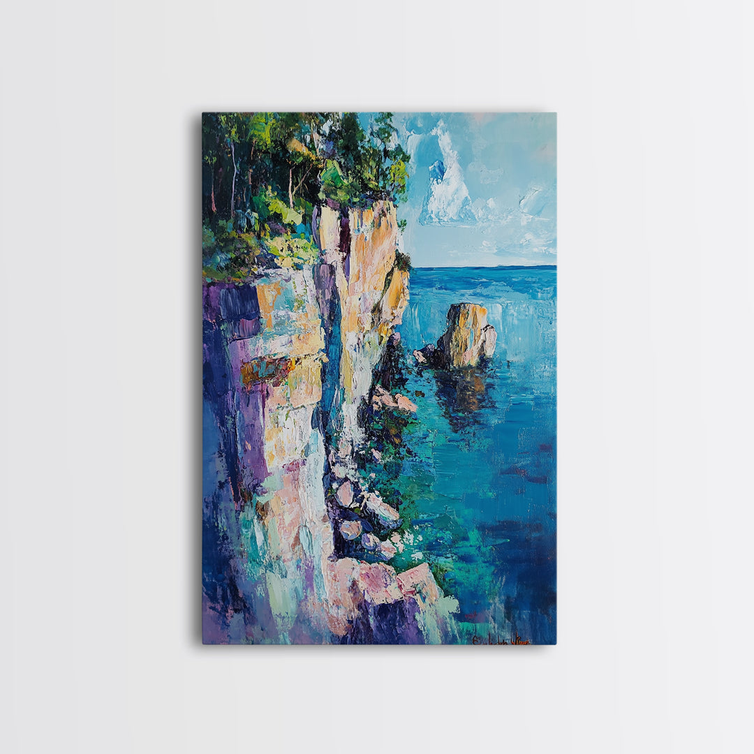 Rocky Cliff, Ocean, Wildflowers Canvas Print, Vibrant Coastal Wall Art, Hallway Nature Scene, Colorful Landscape Painting
