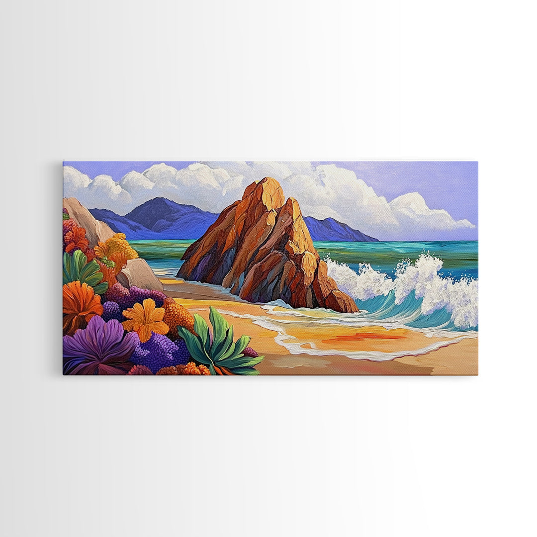 Rocks Beach, Flowers, Ocean, Framed Canvas Print, colorful tropical seascape, modern coastal wall art, bright nature themed decor