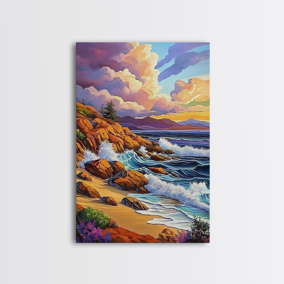 Rocky Coast, Ocean Cliffs, Sunset Mountain Seascape, Framed Canvas Print, Nature Landscape Wall Art, Fall Living Room Wilderness Decor