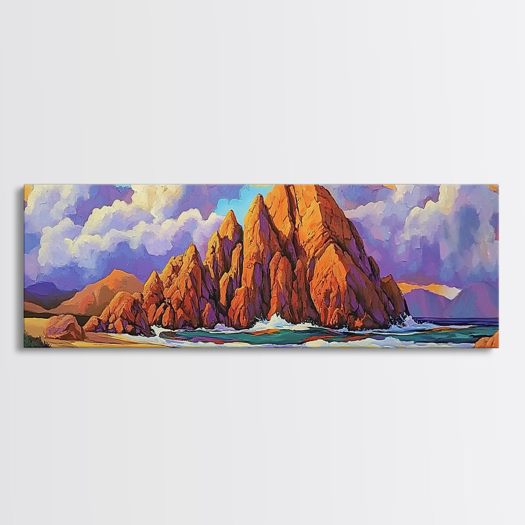 Rocky Cliff Beach, coastal landscape art, framed canvas print, seascape painting, nautical decor, extra wide art, above couch art
