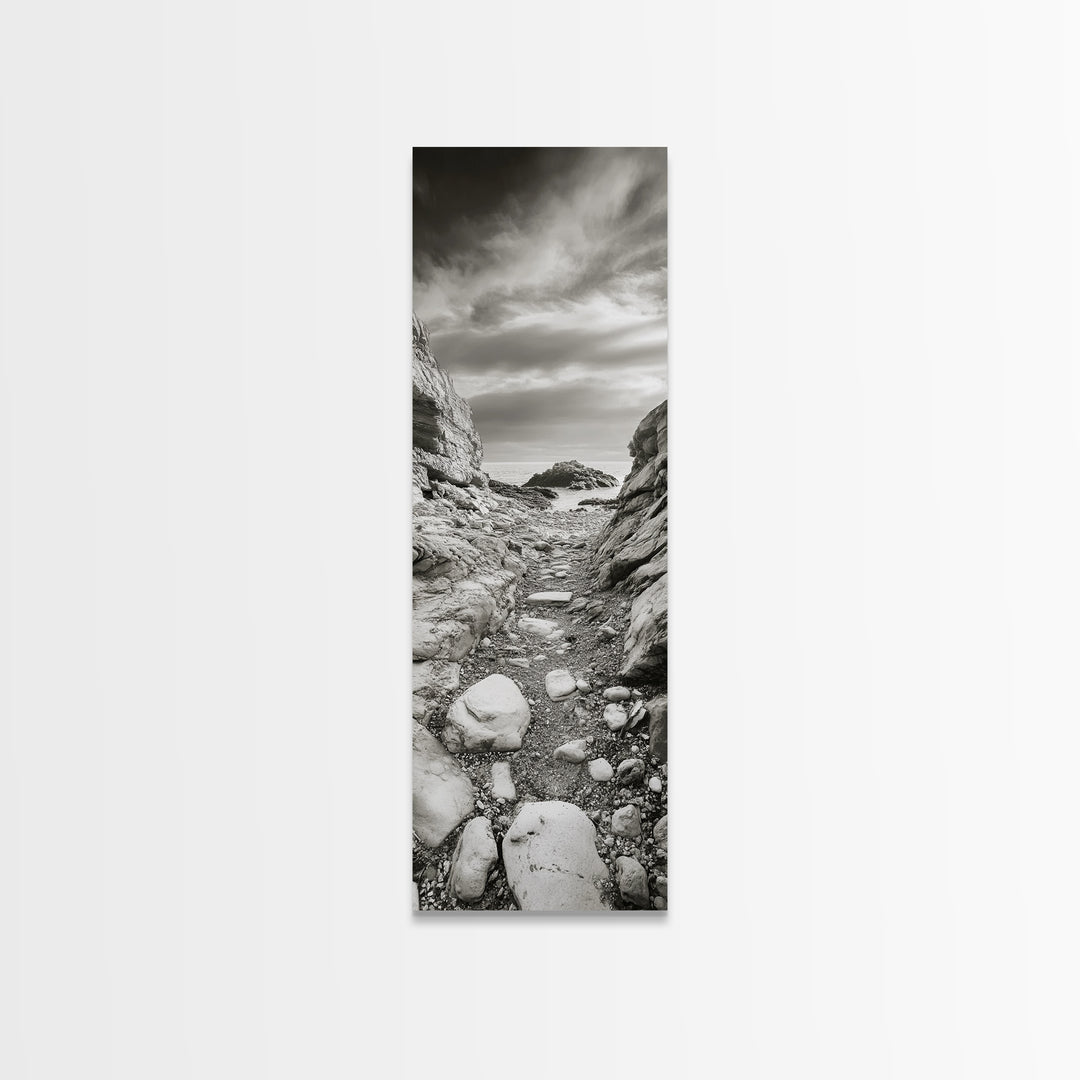 Rocky Cliff Trail, Coastal Hiking, Rugged Landscape, Nature Adventure Art, Framed Canvas Print, Cabin Wall Decor, Black and White Aesthetic