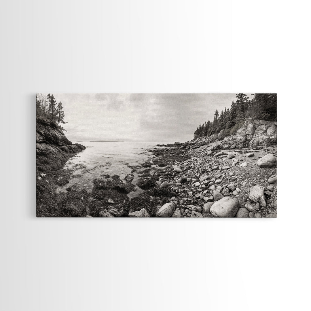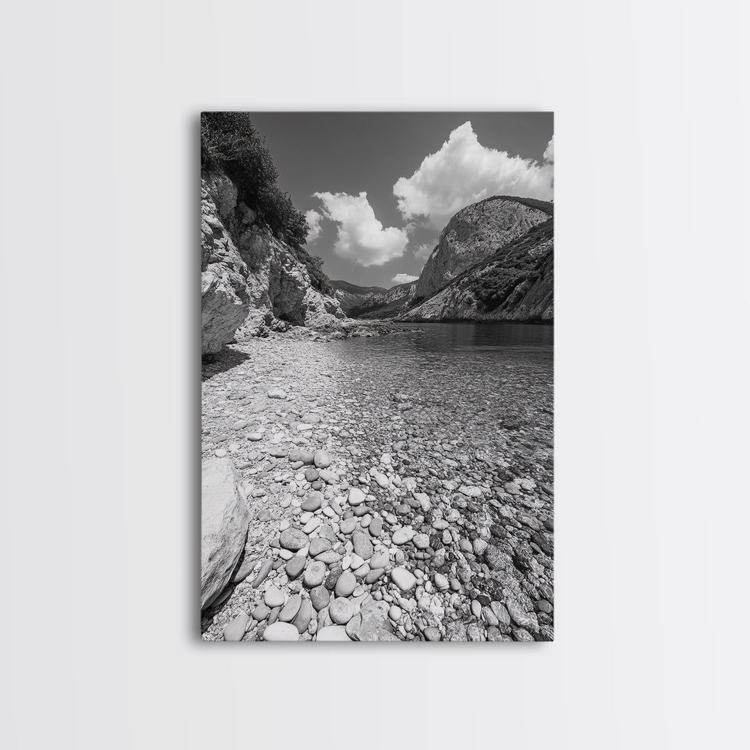 Rocky Beach, Calm Water, Summer Shore, Black White Coastal View, Framed Canvas Print Beach Wall Art, Nature Decor, Coastal Bathroom Style