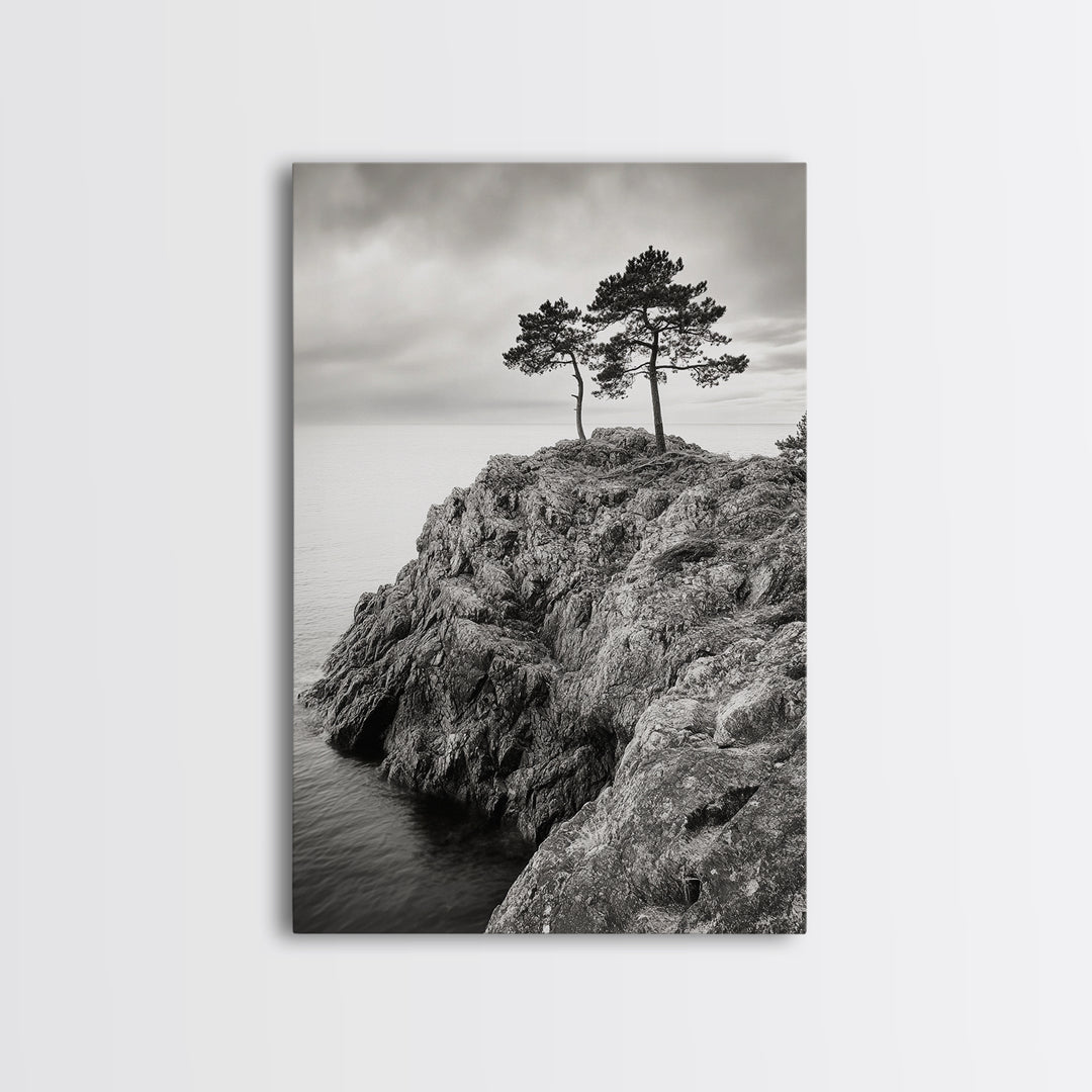 Rocky Coast, Lone Trees, Ocean View, Monochrome Calm, Framed Canvas Print, Bathroom Wall Art, Coastal Style, Minimalist Mountain Art