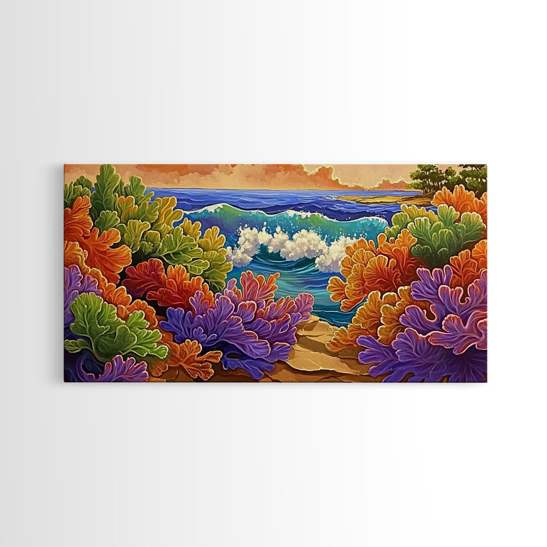 Ocean coral, coastal decor, nautical painting, framed canvas print, marine life art, whimsical ocean scene, tropical beach house wall art