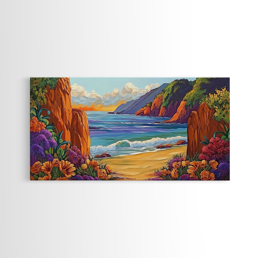 Ocean Cliffside, Flowers, Canvas Print, Colorful beachscape painting, Bathroom Wall Art, vibrant coastal decor,beach flower wall art