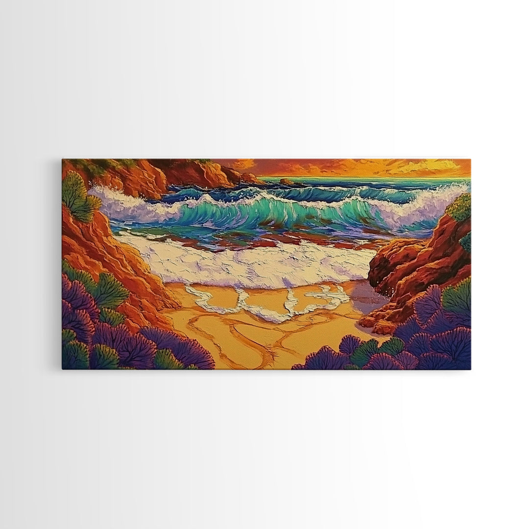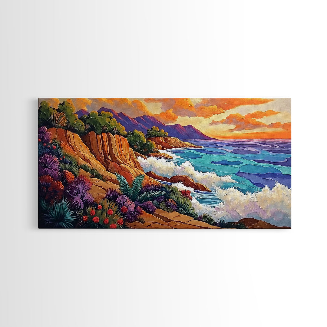 Ocean Cliffs, Sunset, Canvas Print, Vibrant Coastal Wall Art, Living Room Wall Decor, Beach Sunset Painting, Colorful Seascape Artwork